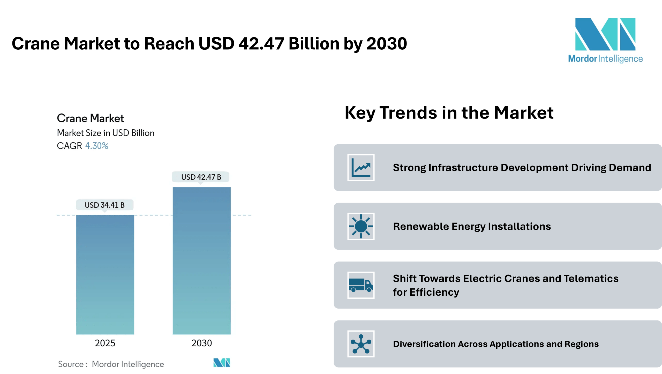 The crane market reached USD 34.41 billion in 2025 and is projected to advance to USD 42.47 billion by 2030, translating into a 4.30% CAGR. This growth is underpinned by a variety of factors, including increased public infrastructure spending, large-scale private megaprojects, and a growing emphasis on renewable energy installations. As the world navigates evolving construction needs and energy transitions, the demand for versatile, high capacity lifting equipment continues to rise.
