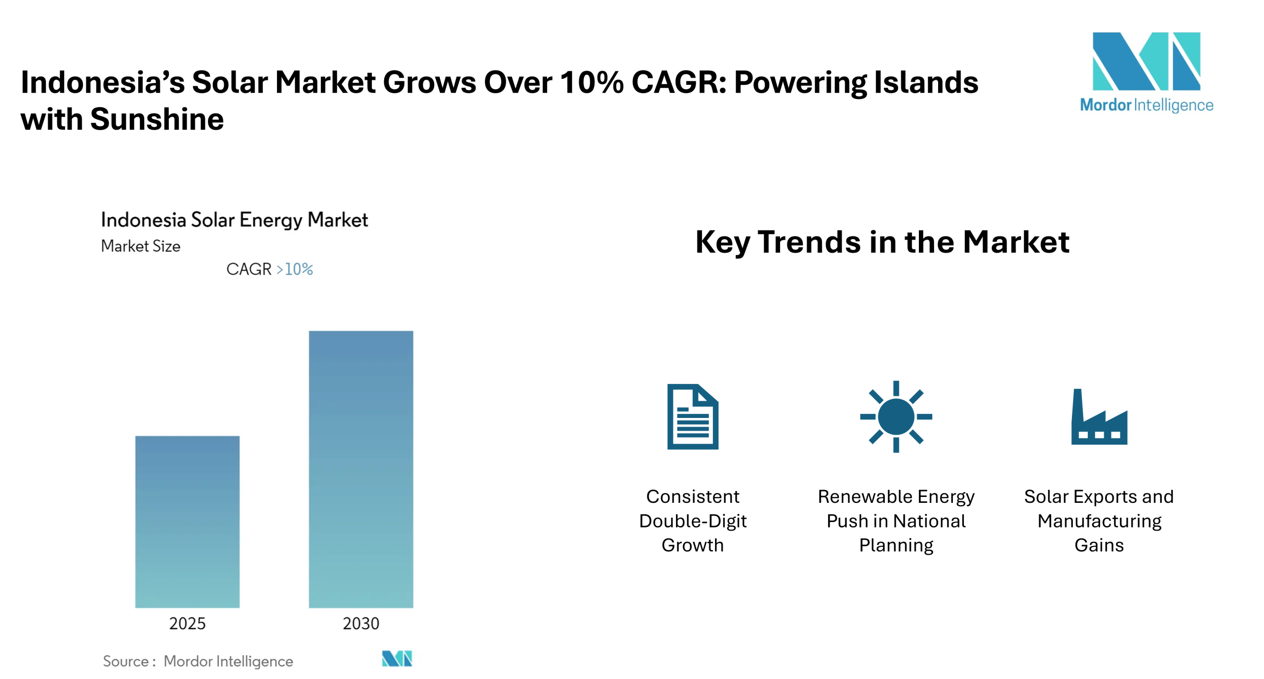 With several local and international players active in both on-grid and off-grid segments, the market is positioned for steady scaling through 2030. It reflects a mix of electrification needs, export potential, and regulatory support. Renewable energy efforts such as the RUPTL plan are unlocking opportunities across the supply chain.